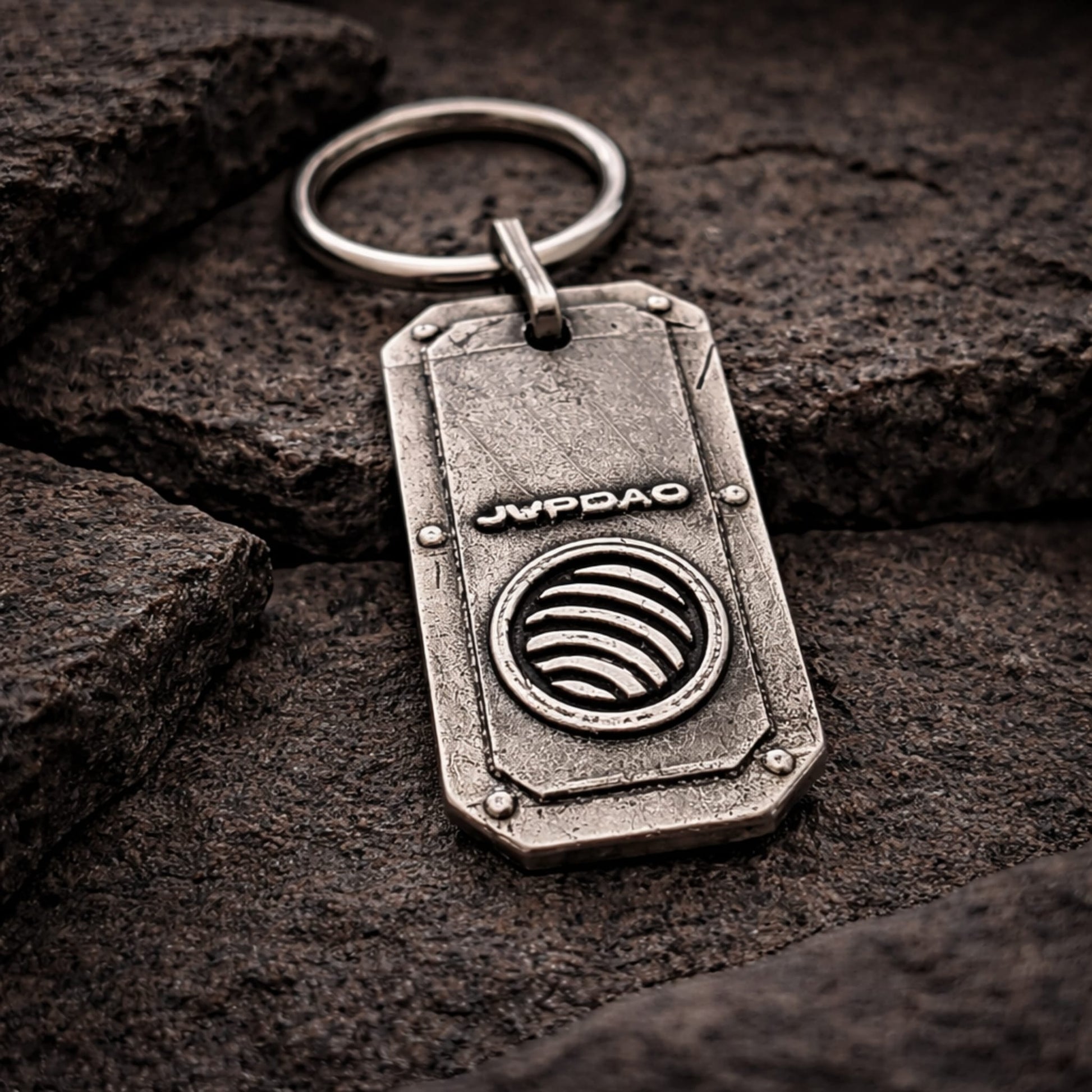 The JUPDAO Keyring is cast in solid 925 sterling silver and finished with a raw, industrial texture inspired by hardware, validators, and physical access tokens. Designed to feel issued rather than styled, it bridges digital identity and physical ownership.